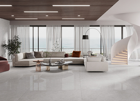 大理石瓷磚以輕松的灰為主色調,結合膚感、止滑、珠光、精雕、柔光、易潔耐磨等產品工藝,締造光感舒適、觸感細潤的簡約時尚空間,讓人在繁忙的生活中擁有靜逸與安閑。